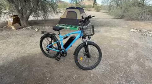 Like most e-bikes in its price range, the Meteors has a 1×7 Shimano drivetrain and mechanical disc brakes. An adjustable front suspension fork helps reduce bumps, and front and rear lights are standard. The Qronge Meteors e-bike rides on 26-inch wheels with 1.95-inch tires.