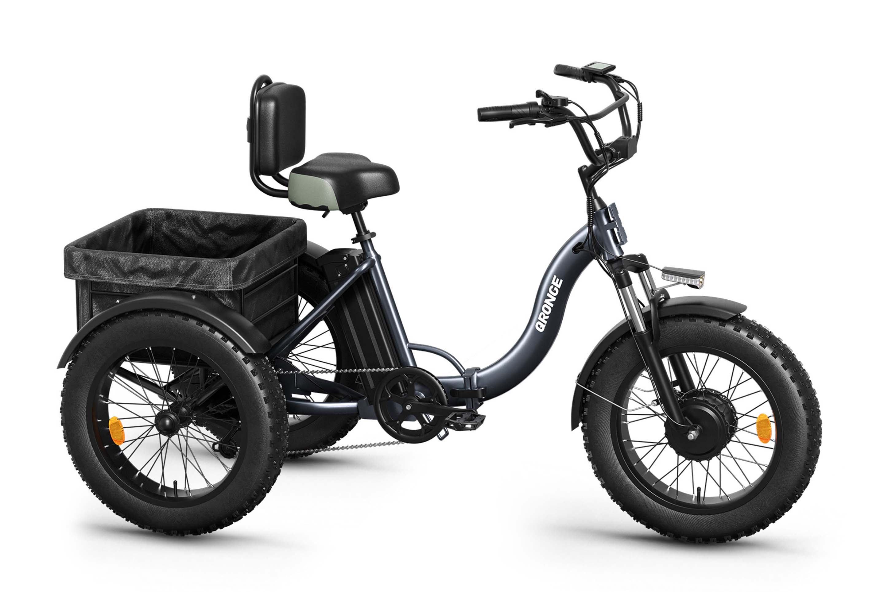 Fat-tire electric trikes are particularly useful. Their wide tires make for easy handling on pavement, gravel, and light off-road trails, and provide better grip and shock absorption. The Qronge Lava stands out in this category. Priced under $1,200, it combines the essential features of a step-in frame, long range, and ample cargo capacity, making it a smart and affordable choice for adult riders.
