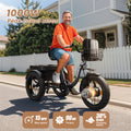 The Qronge Lava is an electric tricycle featuring 20”×4.0” fat tires for enhanced stability and traction, powered by a 1000W peak motor for smooth, confident riding. With a cadence sensor, five riding modes, up to 50 miles of range, and a strong 350+150 lbs max load capacity, this electric tricycle is built to handle daily rides and heavier loads with ease.