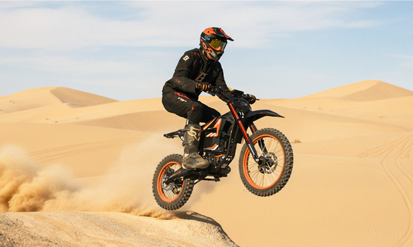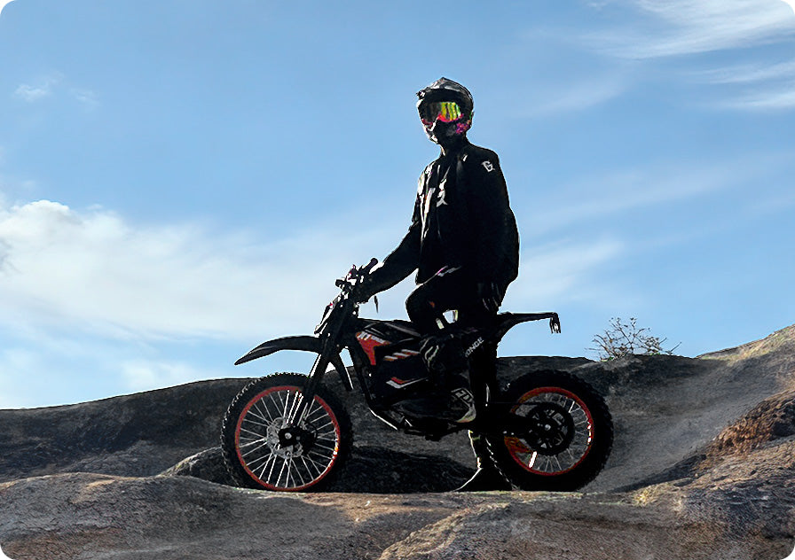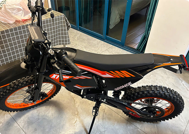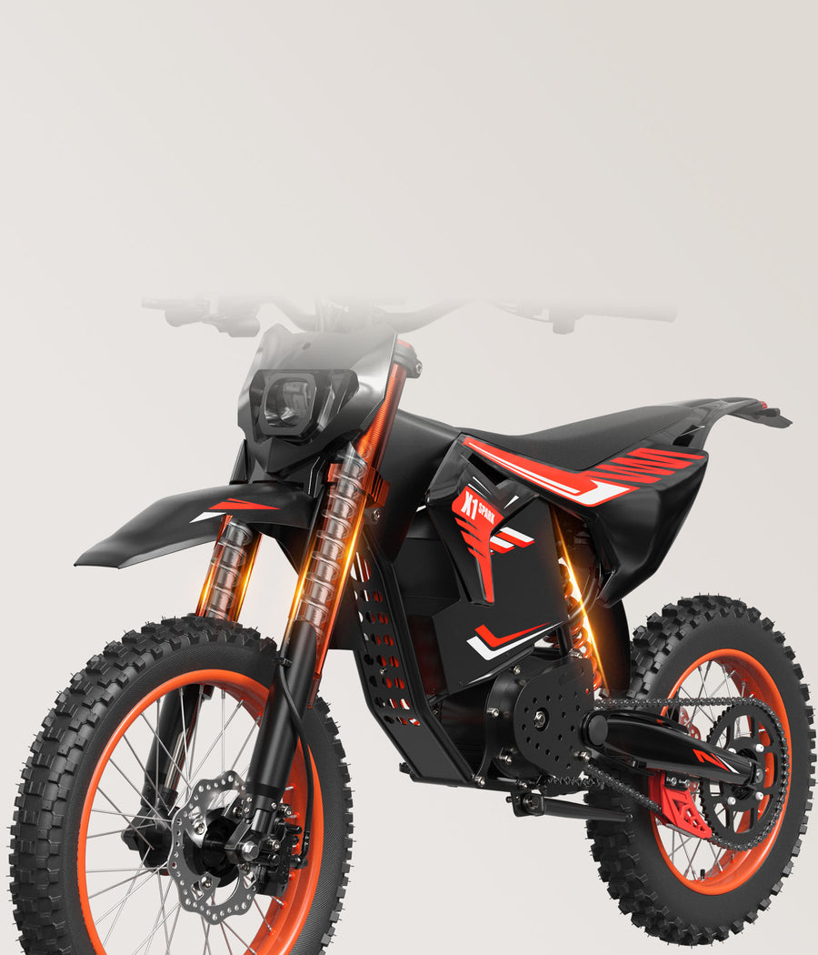 The X1 Spark is a high-performance electric dirt bike, fundamentally different from a standard electric bicycle:Power & Speed: With a 4500W peak motor and a top speed of 50 mph, the X1 Spark's performance dwarfs that of typical e-bikes (which usually assist up to 20-28 mph).Torque & Purpose: It generates a massive 283 Nm of torque for aggressive acceleration and hill climbing, designed for off-road terrain. E-bikes are primarily for paved or light trail use.Design: It features a full motorcycle-style chassis, professional front and rear suspension, and knobby off-road tires, built to handle jumps and rough trails—unlike the frame and components of an e-bike.No Pedals: It is throttle-operated and does not have pedals, operating as a pure motorcycle.